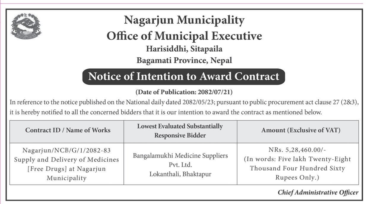 Notice of Intention Award Contract (DOP:2082/07/21)