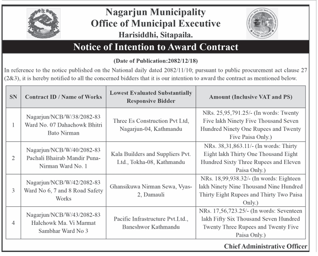 Notice of Intention to Award contract (DOP:2082/12/18)